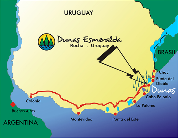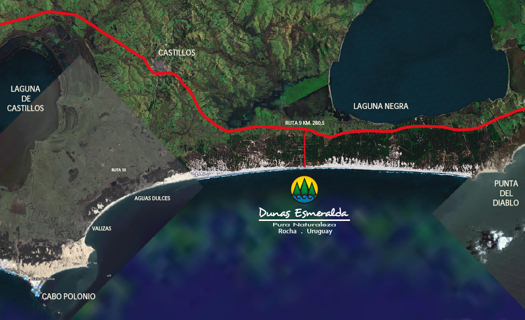 Dunas de La Esmeralda is located at kilometer 280.5 on Interbalnearia Route No. 9, in the Department of Rocha, Uruguay. It is an oceanfront resort situated in the area known as ‘La Angostura’—named for being the narrowest point between Laguna Negra, Route 9, and the Atlantic Ocean, just 3,200 meters apart. Its unbeatable location and a network of excellent highways ensure easy access from Uruguay’s main cities, as well as from neighboring countries like Argentina and Brazil.